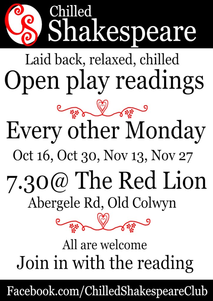 Promoting Shakespeare readings in a small town is always a challenge. How to build up the number of attendees is a perennial conversation. The way I’ve promoted the event in the past is through a Facebook page which allows you create and promote events on the various local interest groups, and with printed A4 posters distributed public noticeboards and shop windows around town.